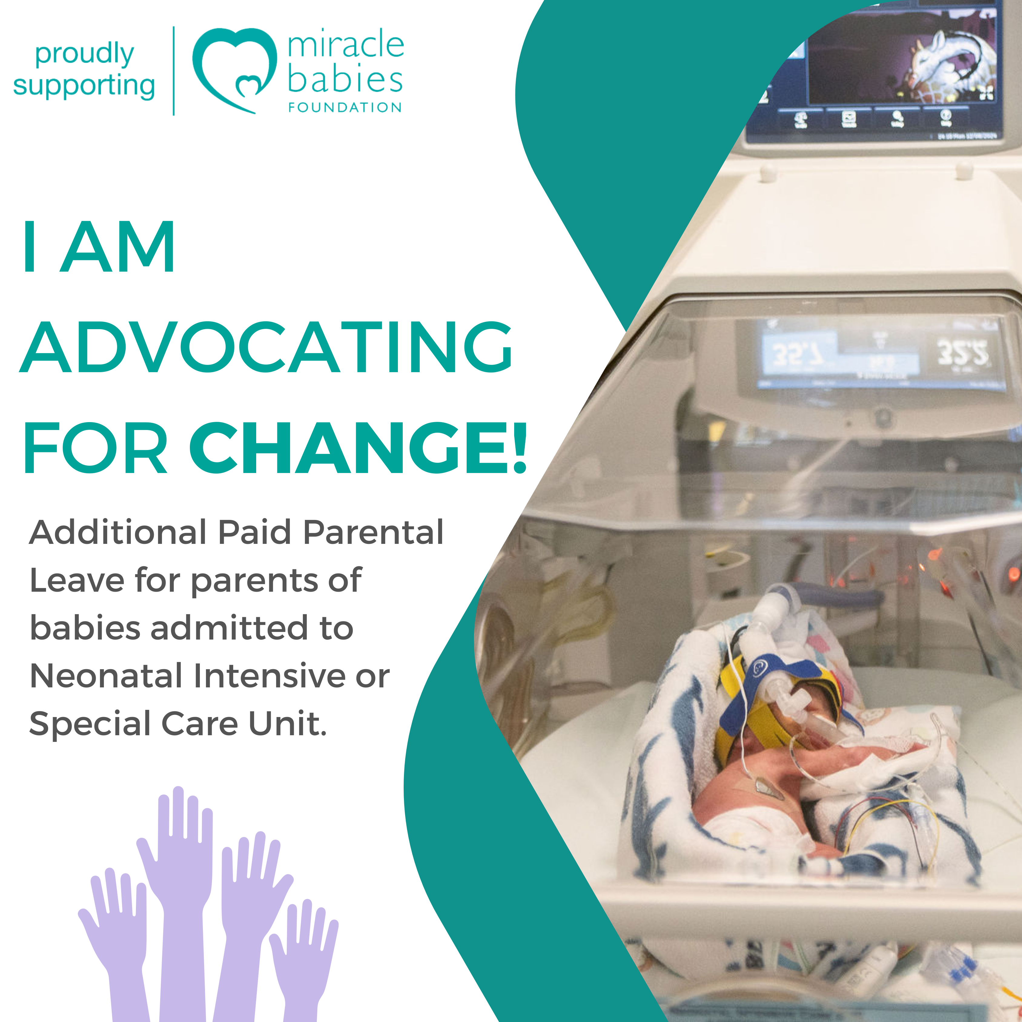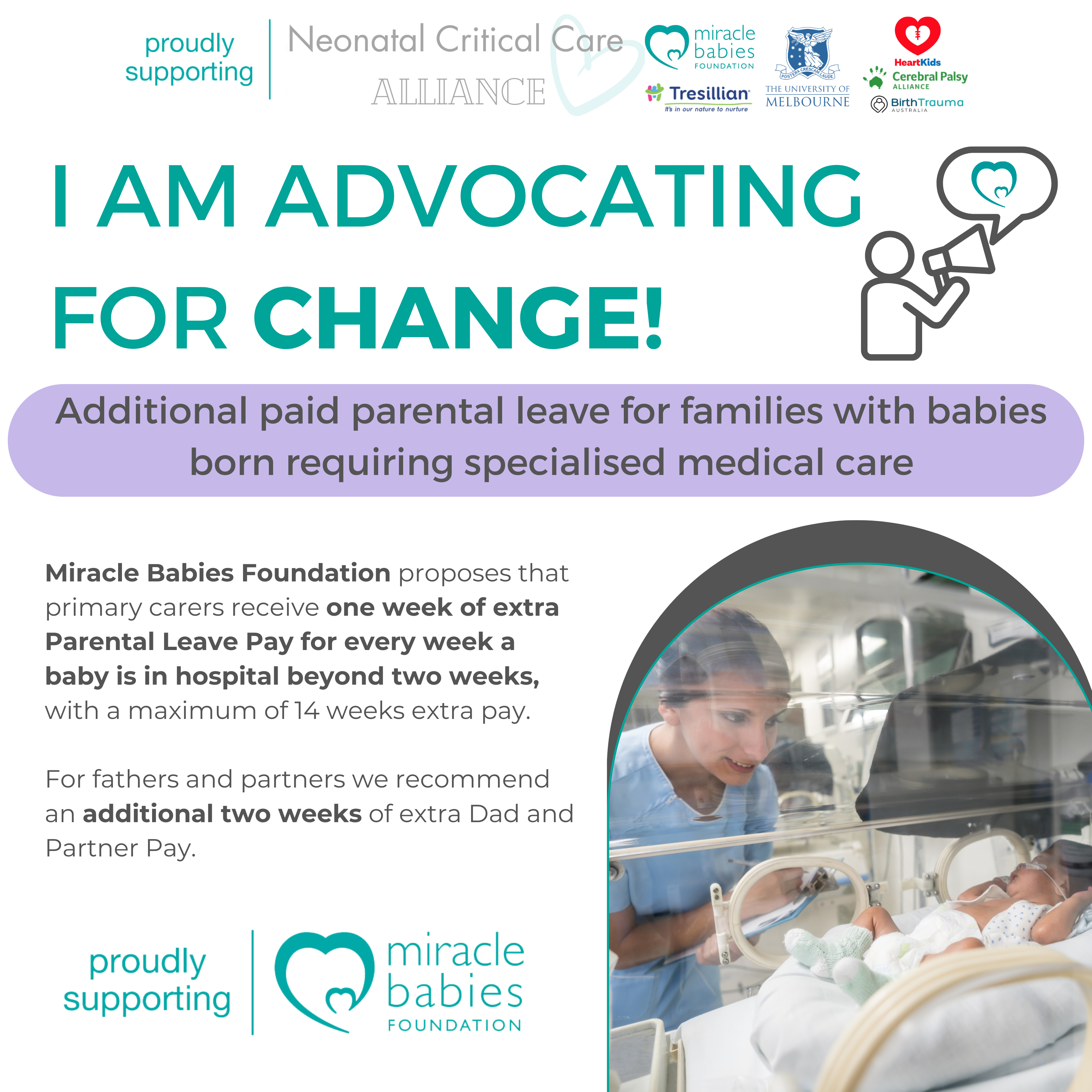 Miracle Babies Foundation continue to advocate for healthcare professionals and families to call on the Australian Government to provide additional Paid Parental Leave entitlements during the critical care period when a baby born premature or critically ill spends a significant time in hospital. Australian Government employees are entitled to Paid premature birth leave, which is available from the date of birth to what would have been 37 weeks gestation.