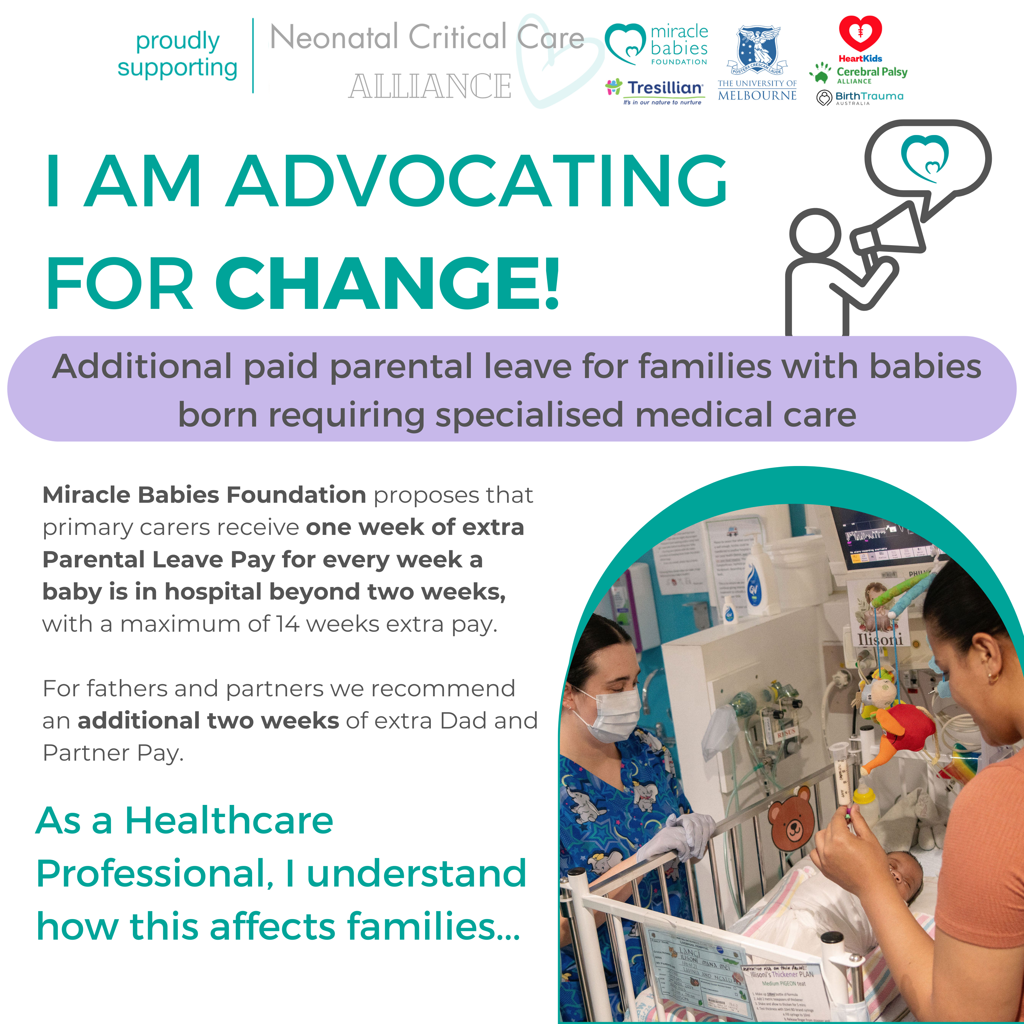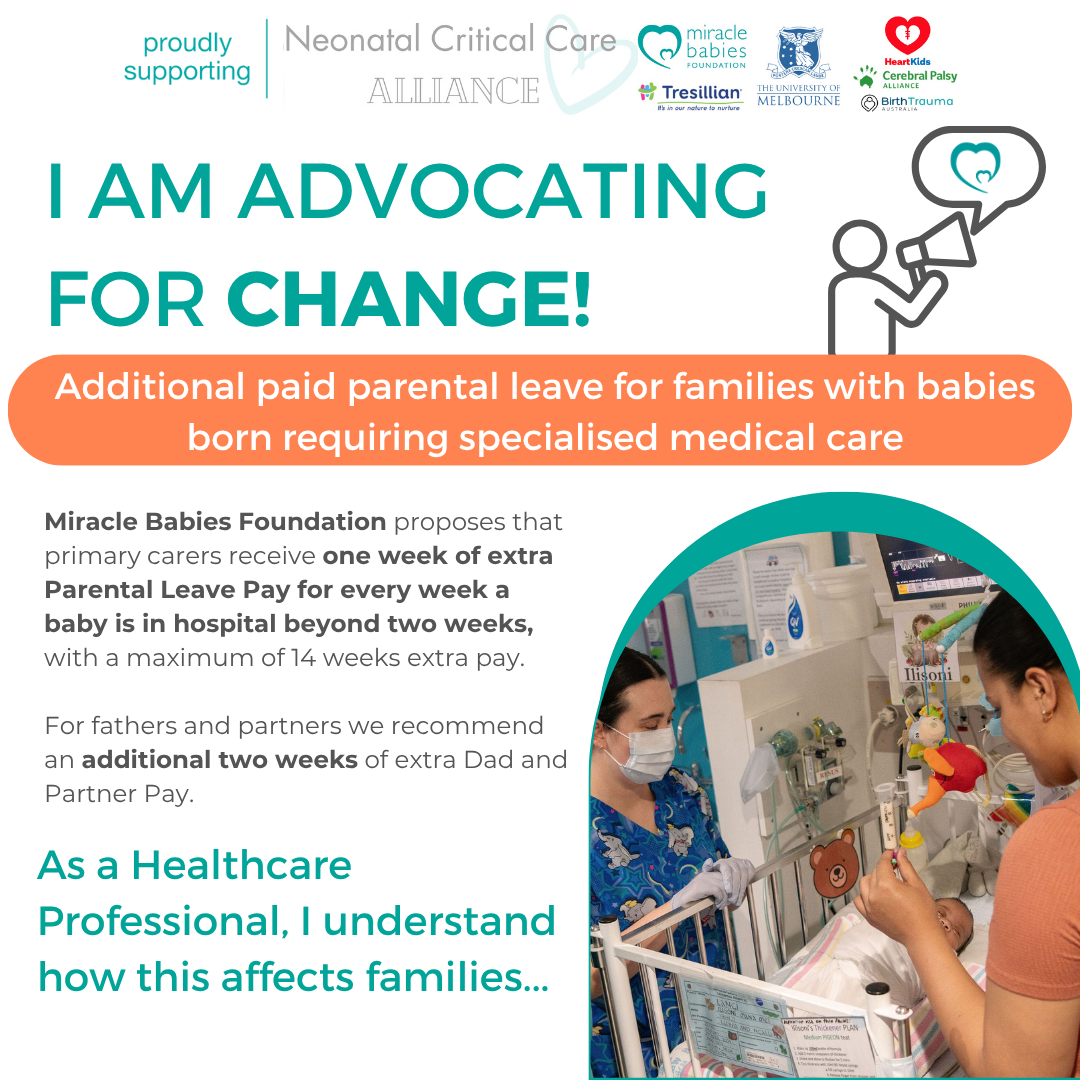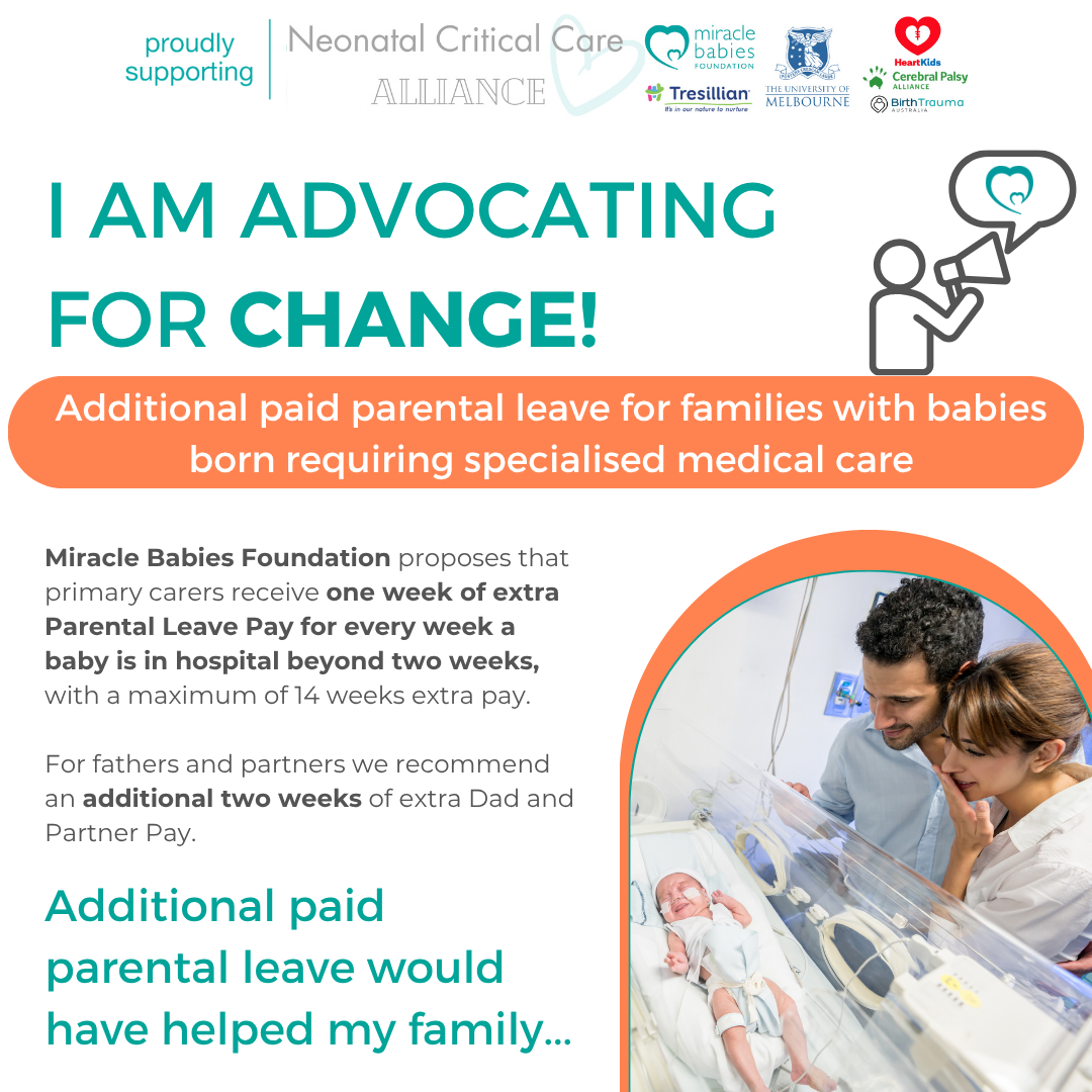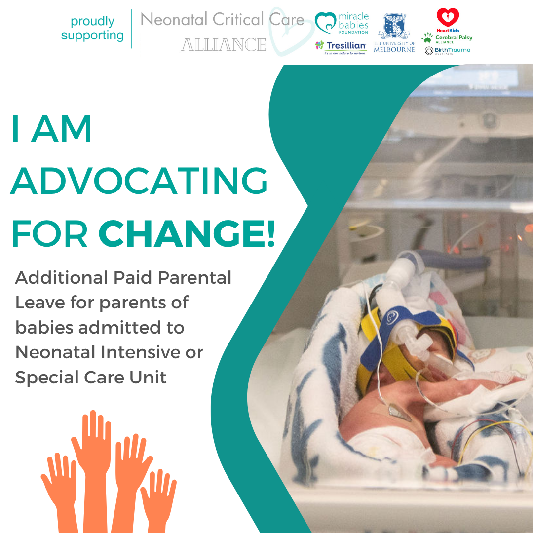 Help us advocate for an additional leave entitlement (Critical Care Payment) with the Australian Government, providing greater support for parents of premature and sick babies, during their time in neonatal care.