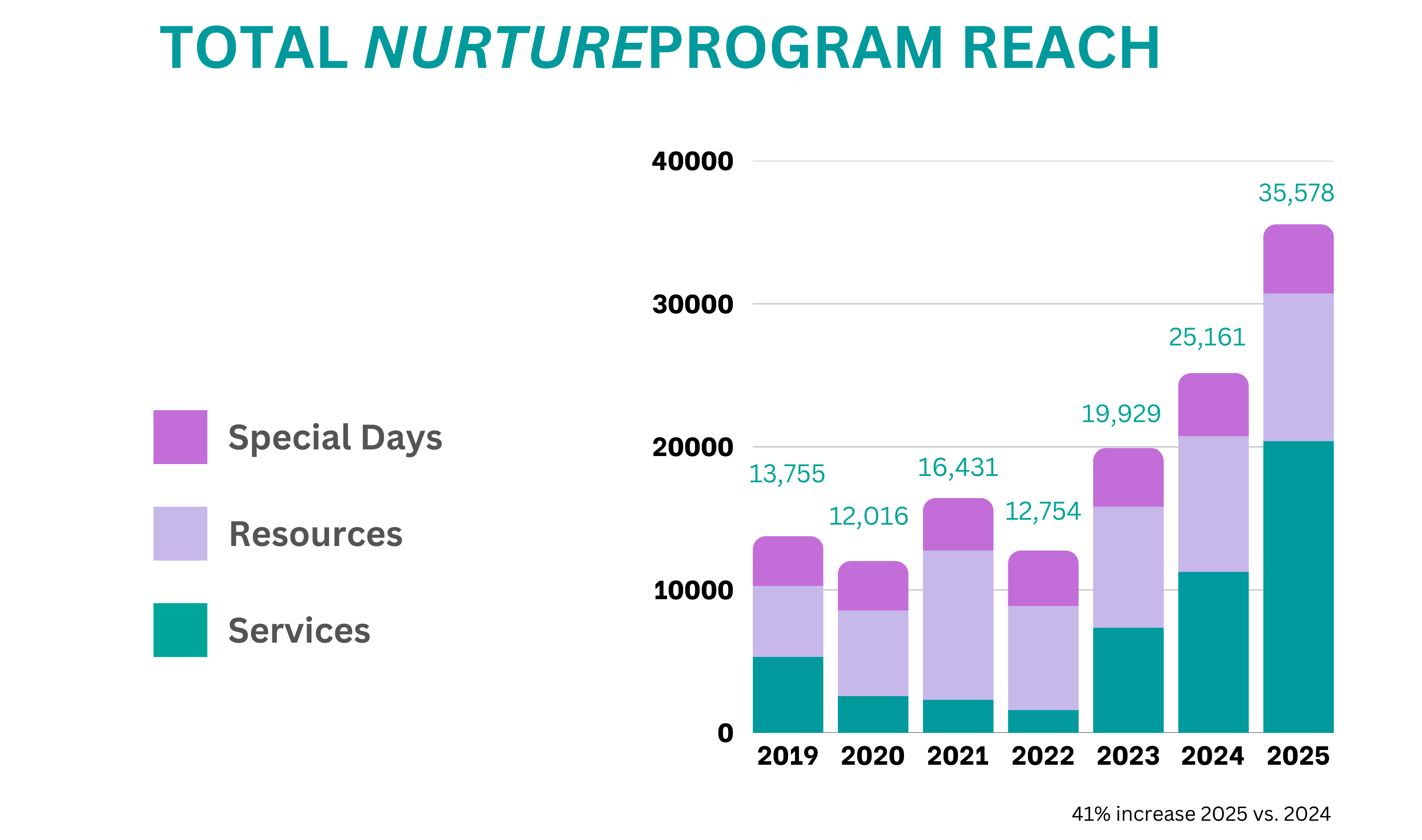 In 2025, We also achieved over 500,000 page views on our website for support, education and information. Our Nurture E Information Hub is a valuable resource assisting families through different life stages from Pregnancy to Adulthood and the years between.