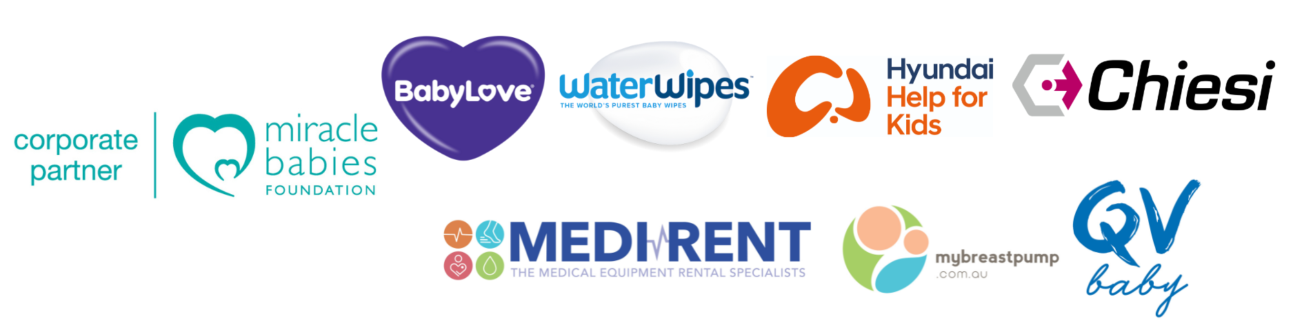 We thank our Corporate Partners, BabyLove, WaterWipes, Chiesi, and Hyundai Help for Kids for their continued support each year. In 2025, we were also pleased to welcome QV Baby and mybreastpump.com.au, who joined our Corporate Partners in supporting our miracle families.